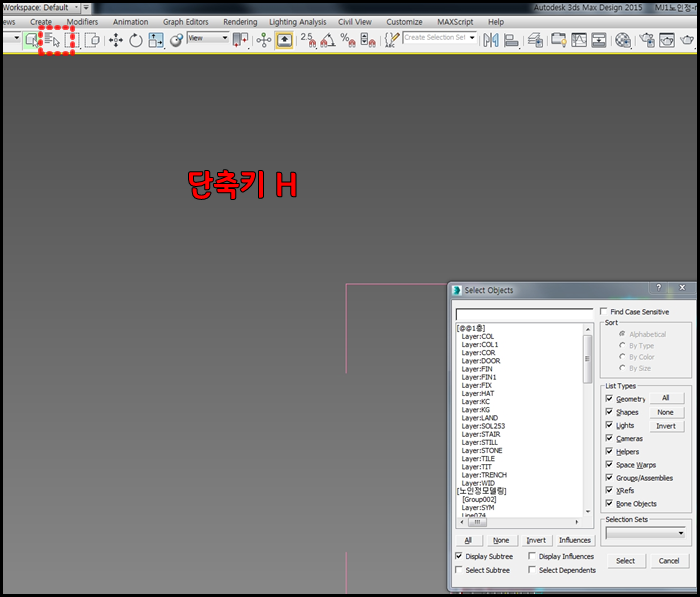 상단 메뉴나 단축키 H를 누르면 select objects창이 열리는데 조금 더 보기 편하게 하려면 아래 처럼 설정하면 된다.