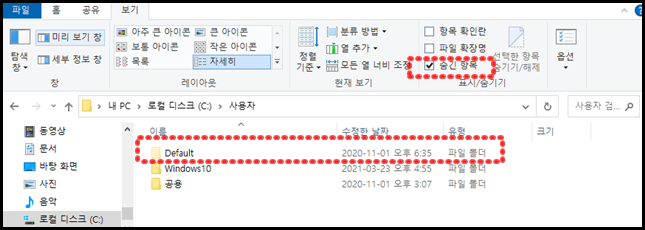 2. 사용자(User) 폴더에서 상단 메뉴에 보기(View) 탭을 선택한 후 숨긴 항목에 체크하기